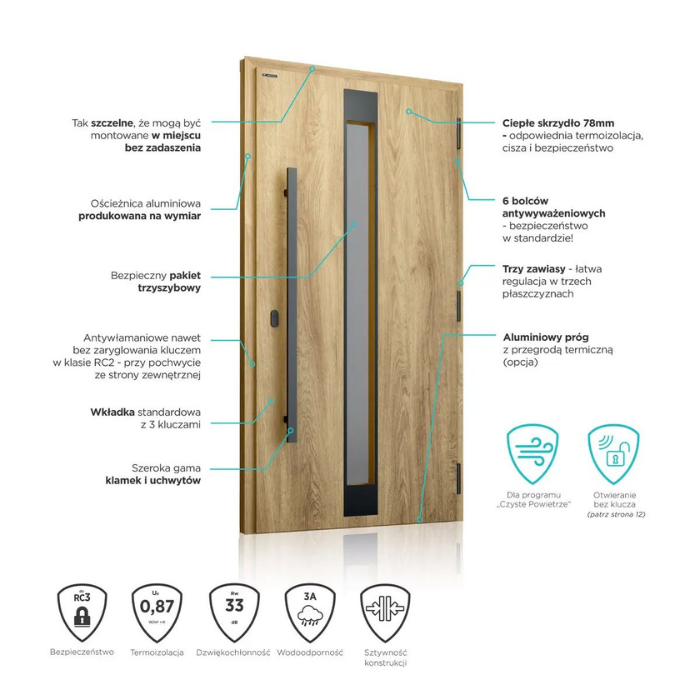 • Bezpieczeństwo: Drzwi są wyposażone w systemy antywłamaniowe, w tym solidne zamki i zawiasy, zapewniające wysoki poziom ochrony.