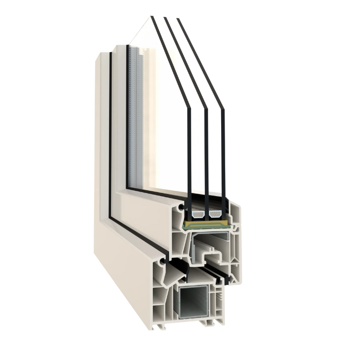 - Profil klasy A: 6-komorowy system o głębokości zabudowy 76 mm, który zapewnia optymalną izolację termiczną i akustyczną.